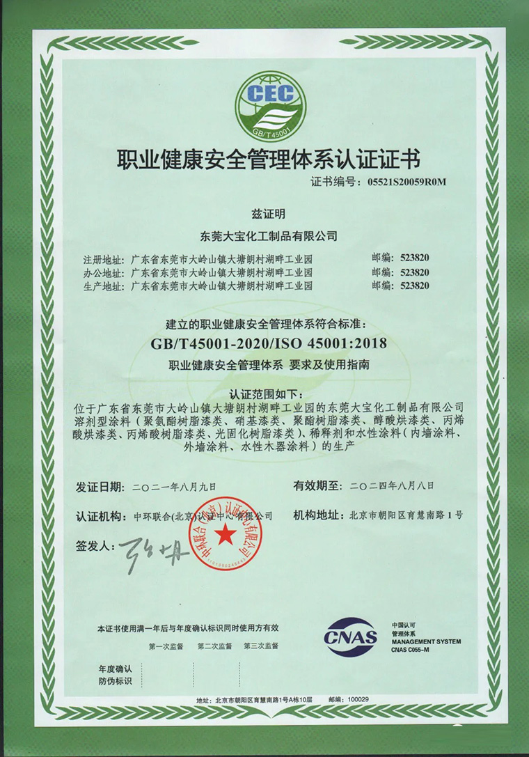 近日,大寶漆正式通過GB/T45001-2020/ISO45001:2018職業(yè)健康安全管理體系認(rèn)證,意味著大寶漆獲得國際權(quán)威機構(gòu)認(rèn)可,將為公司后續(xù)的安全穩(wěn)定與可持續(xù)的長遠(yuǎn)發(fā)展提供強有力的保障。