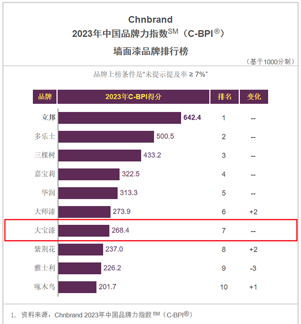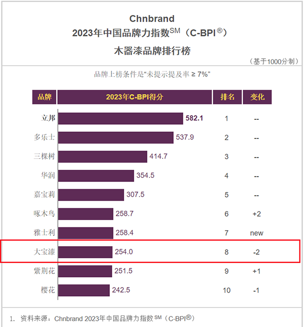 4月18日,品牌評級機構(gòu)Chnbrand發(fā)布2023年第十三屆中國品牌力指數(shù)sm(C-BPI)品牌排名,大寶漆再度上榜“墻面漆品牌排行榜”、“木器漆品牌排行榜”雙榜單,彰顯品牌影響力。
