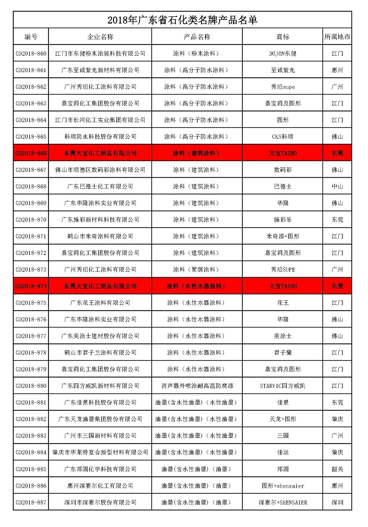 根據(jù)《廣東省名牌產(chǎn)品評價指南》標(biāo)準(zhǔn)要求,在企業(yè)自愿申報的基礎(chǔ)上,經(jīng)申報資料初審、申報數(shù)據(jù)公示、企業(yè)現(xiàn)場審查、專家綜合評價、廣東質(zhì)量品牌評審專家委員會審議確認(rèn),授予大寶化工生產(chǎn)的“大寶漆”牌涂料(詳見附件)為2018年度廣東省“石化類名牌產(chǎn)品”。