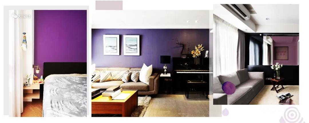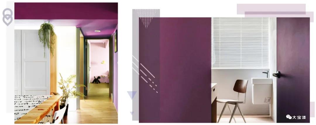 黑加侖紫是一種色澤比較濃郁又帶有粉調的紫色,可以將紫色的高雅與粉色的溫柔融合得很完美。黑加侖紫是安靜而浪漫的,深沉而前衛,帶有一種復古而優雅的氛圍。雖然在家居應用中并不常見,且在室內空間內,大面積使用黑加侖紫其實不大好把控,需要把握好搭配色調和整體比例,可以通過強烈的色彩碰撞帶來驚艷的效果,它也可以搭配高檔中性的灰色、米黃色、黃色等色彩,適度增強空間的亮度。